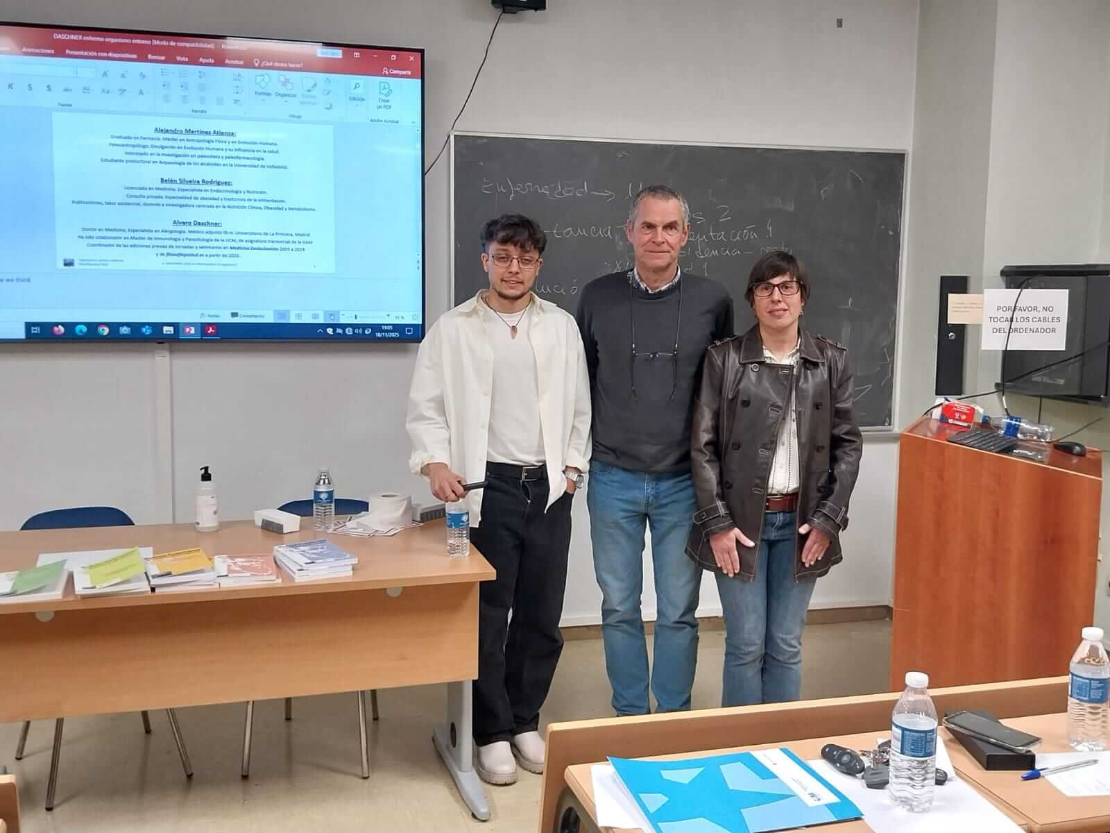 Alejandro Martínez Atienza, encargado de la ponencia con el título “Síndrome metabólico: Adaptaciones genéticas potenciales en homo sapiens”, comenzó introduciendo el enfoque evolutivo de la antropología y la biología en el ámbito médico como Medicina Evolutiva. Lejos de querer disociarse de la Medicina convencional, esta disciplina pretende entender los procesos de salud y enfermedad por medio de las herramientas que nos ofrece la biología evolutiva. Así, presento datos que apoyaban la idea como ciertas adaptaciones presentes en nuestra especie (como las mutaciones en el gen GULO o en la urato-oxidasa, o procesos fisiológicos como la resistencia a la insulina) pudieron aumentar la eficacia biológica de la especie en el pasado, pero se tornan desadaptativas en el presente. Características que en nuestro pasado surgieron como amortiguadores ecológicos ante la incertidumbre ambiental (como la capacidad para ganar grasa) se convierten hoy en uno de los principales impulsores del aumento sin precedentes de enfermedades crónicas no transmisibles. Insistió, sin embargo, del peligro del exagerado adaptacionismo, ya que no todos los rasgos en Biología son adaptativos. El interés de su contribución y la siguiente enfocada a la obesidad se manifestó en unas preguntas del debate relacionadas con las diferentes formas de dieta, específicamente el ayuno intermitente. Desde una perspectiva paleoantropológica, pero también fisiológica, se abordaron así conceptos como el el citado ayuno intermitente o la salud de las poblaciones de cazadores-recolectores, insistiendo en varias ocasiones que las ocasionalmente postuladas hambrunas del paleolítico no tienen fundamento contrastado y sí su aparición desde el neolítico, cuando comenzaron los asentamientos, la agricultura, la ganadería y así también la estratificación social.