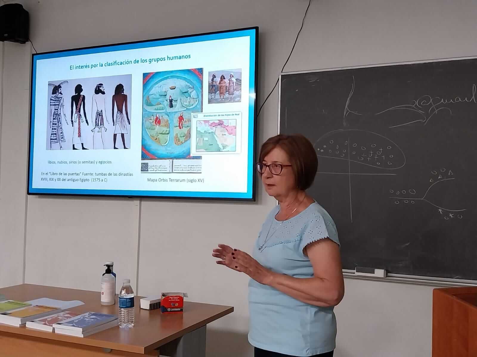 La profesora Lola Marrodán nos presentó una profundización en las categorías analíticas empleadas para el análisis, medición y descripción de la variabilidad en los modelos de estudio de la evolución humana. La predisposición cognitiva humana a la categorización de la diversidad fenotípica se ha expresado en los pueblos antiguos o en las descripciones de viajeros y cronistas; y se consolidó en las clasificaciones naturalistas de los tipos humanos de los Gabinetes ilustrados y, fundamentalmente, en las tipologías raciológicas del siglo XIX y principios del siglo XX. Las primeras clasificaciones taxonómicas de los tipos humanos de la Historia Natural de la Ilustración y las explicaciones ligadas a los conceptos de aclimatación y degeneración ambiental, progresaron con el desarrollo de las ciencias naturales positivistas decimonónicas, en la formulación de técnicas de medición de la variabilidad humana (craneometría, antropometría, somatometría…), sobre las que apoyaron, sus tipologías y clasificaciones raciales. Junto a la descripción de la diversidad “viva” en las poblaciones humanas, en el final del siglo XIX y comienzos del siglo XX, aparecen pruebas fósiles de formas humanas diversas de nuestro pasado, que contribuyen a la formulación de clasificaciones raciales y de jerarquías evolutivas de las especies y razas de humanos actuales o del pasado. Donde las razas “no blancas” actuales eran vistas como formas o líneas fallidas o restos de variedades humanas primitivas o ancestrales, frente a la posición otorgada a los europeos como cúspide de la evolución biológica y del progreso civilizatorio. El obsesivo anhelo por la clasificación condujo a una atomización de la variabilidad en innumerables variedades locales, donde el indefendible puzzle de las razas humanas, vino a ser cuestionado junto con su pensamiento tipológico de base, por los enfoques del pensamiento poblacional, de la mano de los estudios genéticos de las poblaciones humanas, iniciados en el segundo tercio del siglo XX, y convertidos en la base para el estudio de diversidad humana en las últimas décadas del siglo XX. Un nuevo esquema que describía la variación gradual y continua (y ya no jerárquica) de las poblaciones humanas (expresada en clines, polimorfismos y haplotipos). En un paisaje de análisis de la variabilidad al que se suman los nuevos elementos que aporta la genómica, la epigenética y la plasticidad biológica, que nos muestra como la biodiversidad humana obedece a múltiples razones genéticas, epigenéticas, ontogénicas, ambientales, etc.